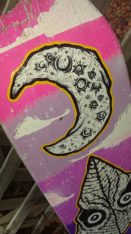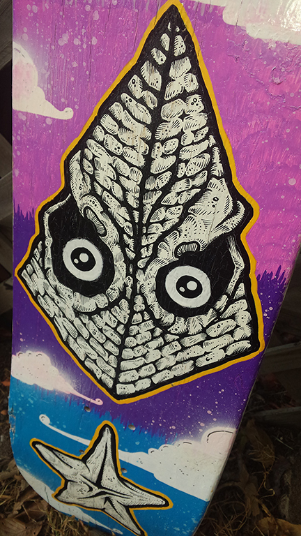 Original hand painted skate deck suitable for wall hanging or other display. Retired skate board painted with my original design in acrylic and aerosol. Perfect for skaters and appreciators of art in general.