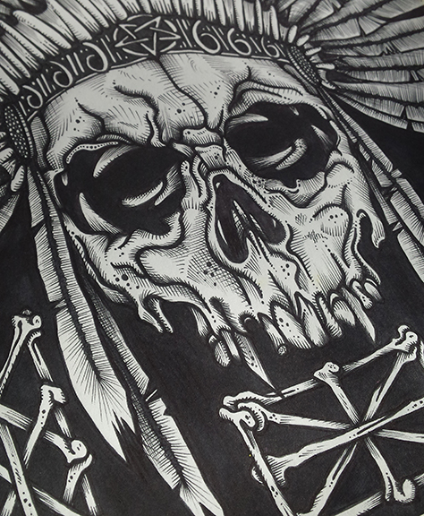 Highly detailed ink and permanent ink drawing of a skull in my trademark style, wearing a native headdress with some symbolism represented in bone configurations.
