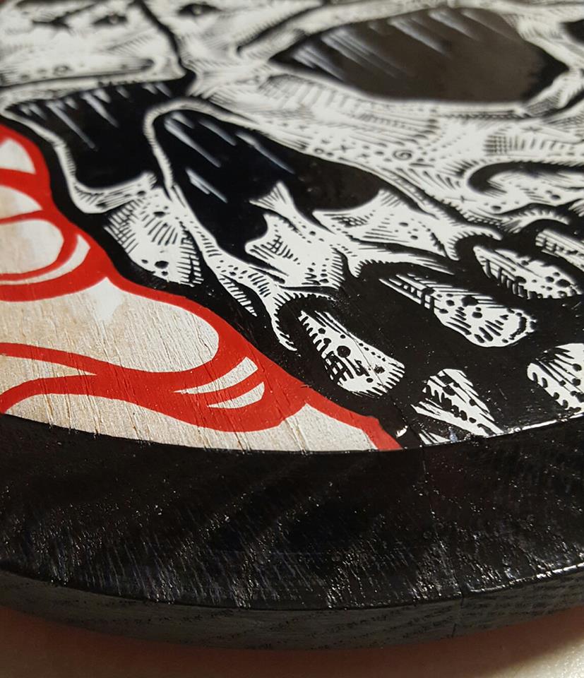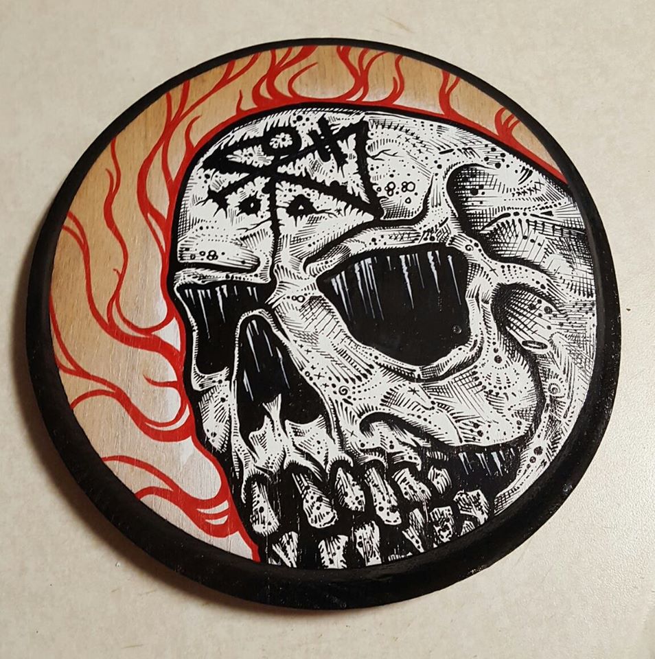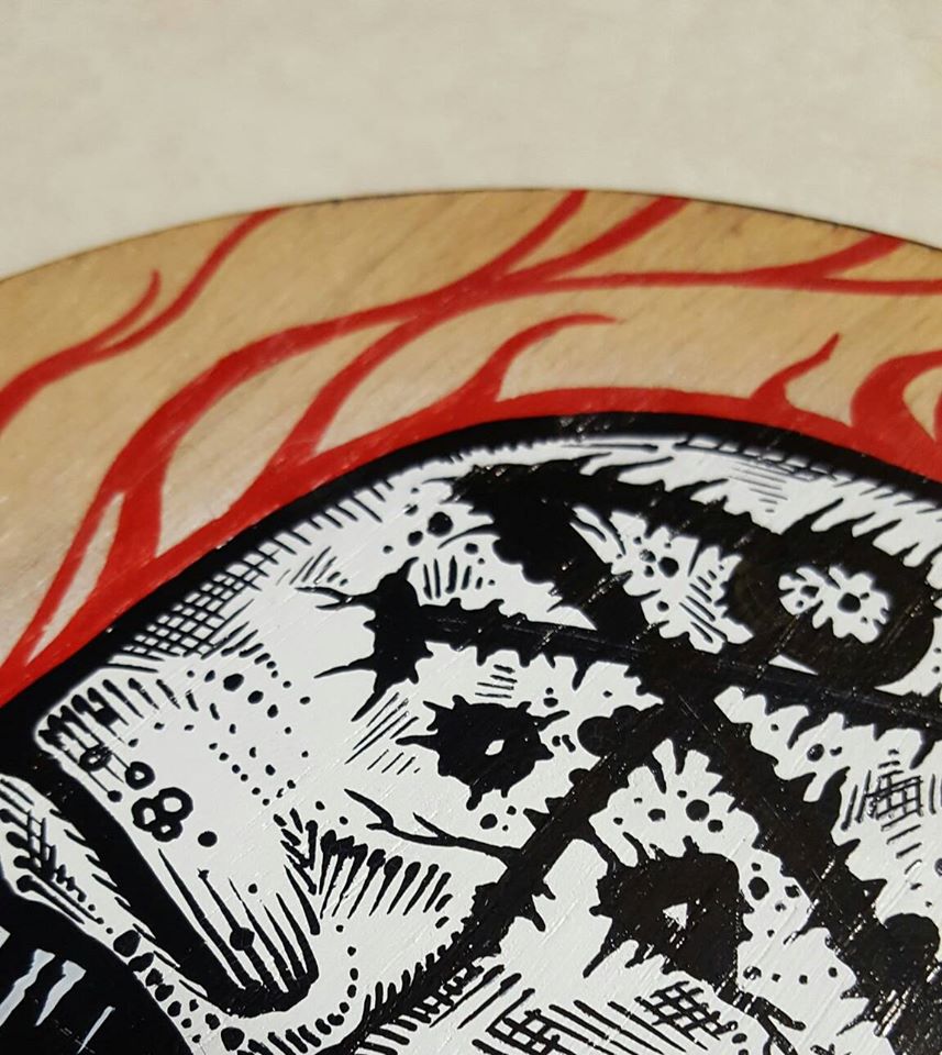 8" across. Acrylic and oil on beveled edge wood circle with under painting.