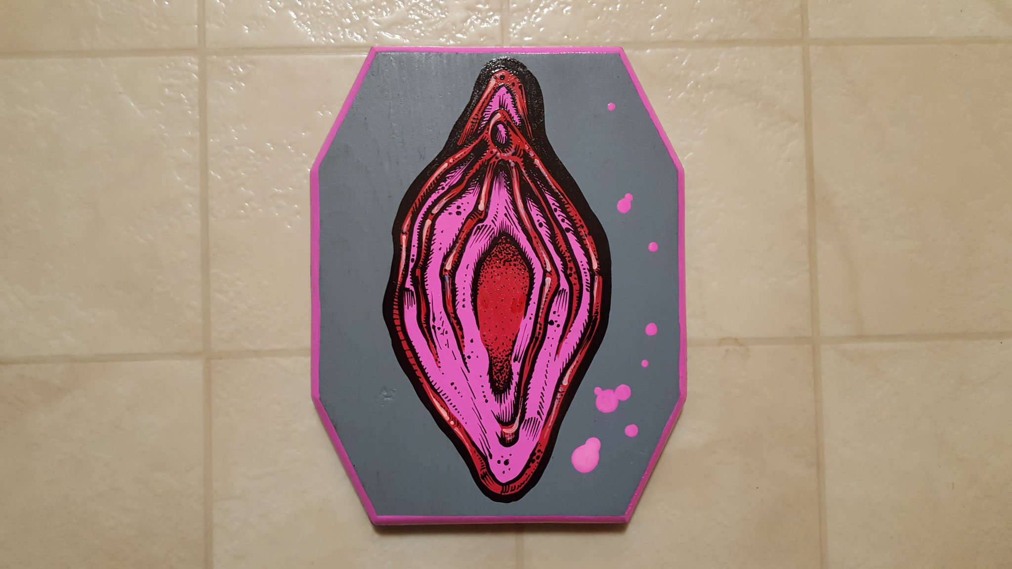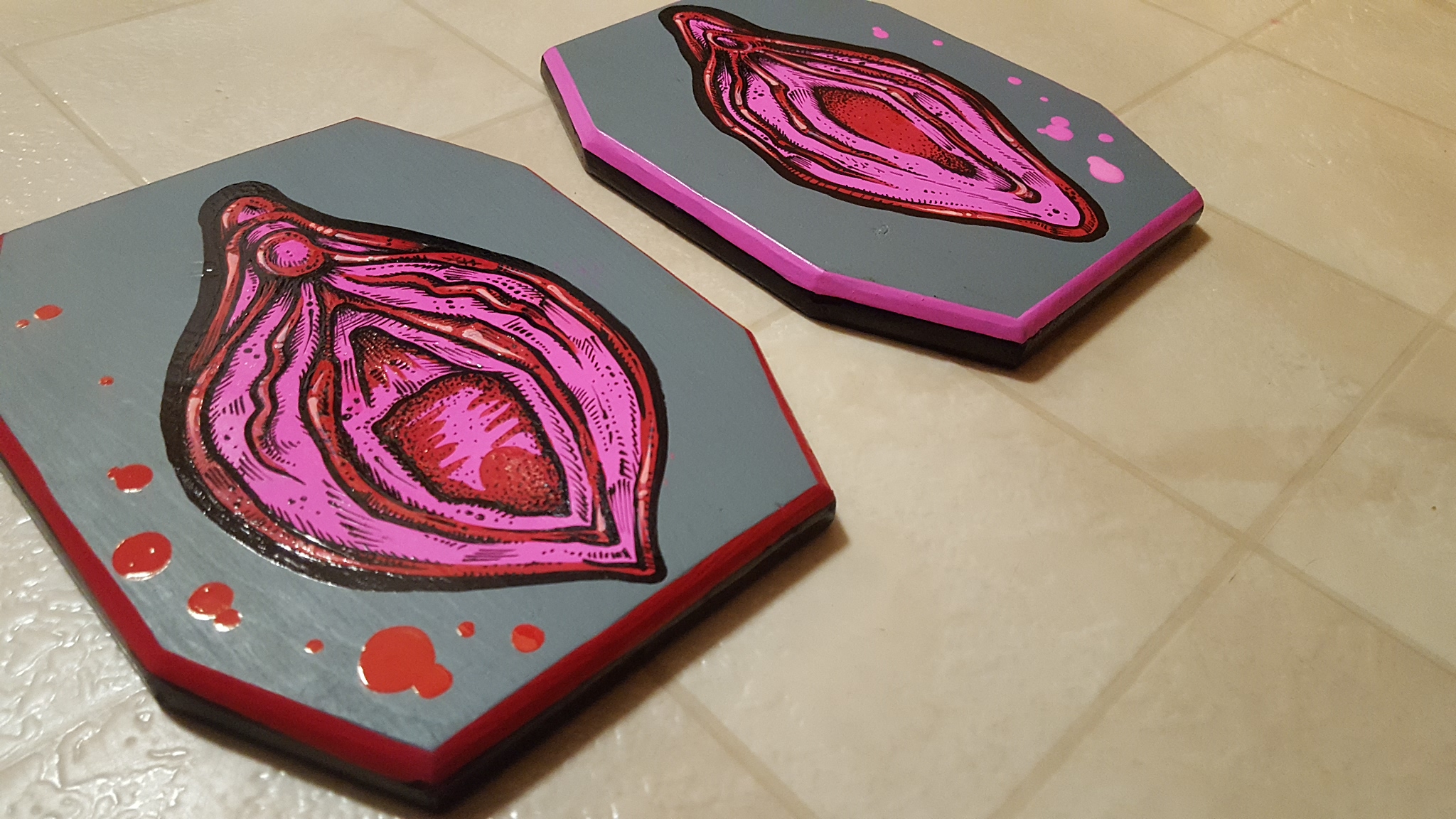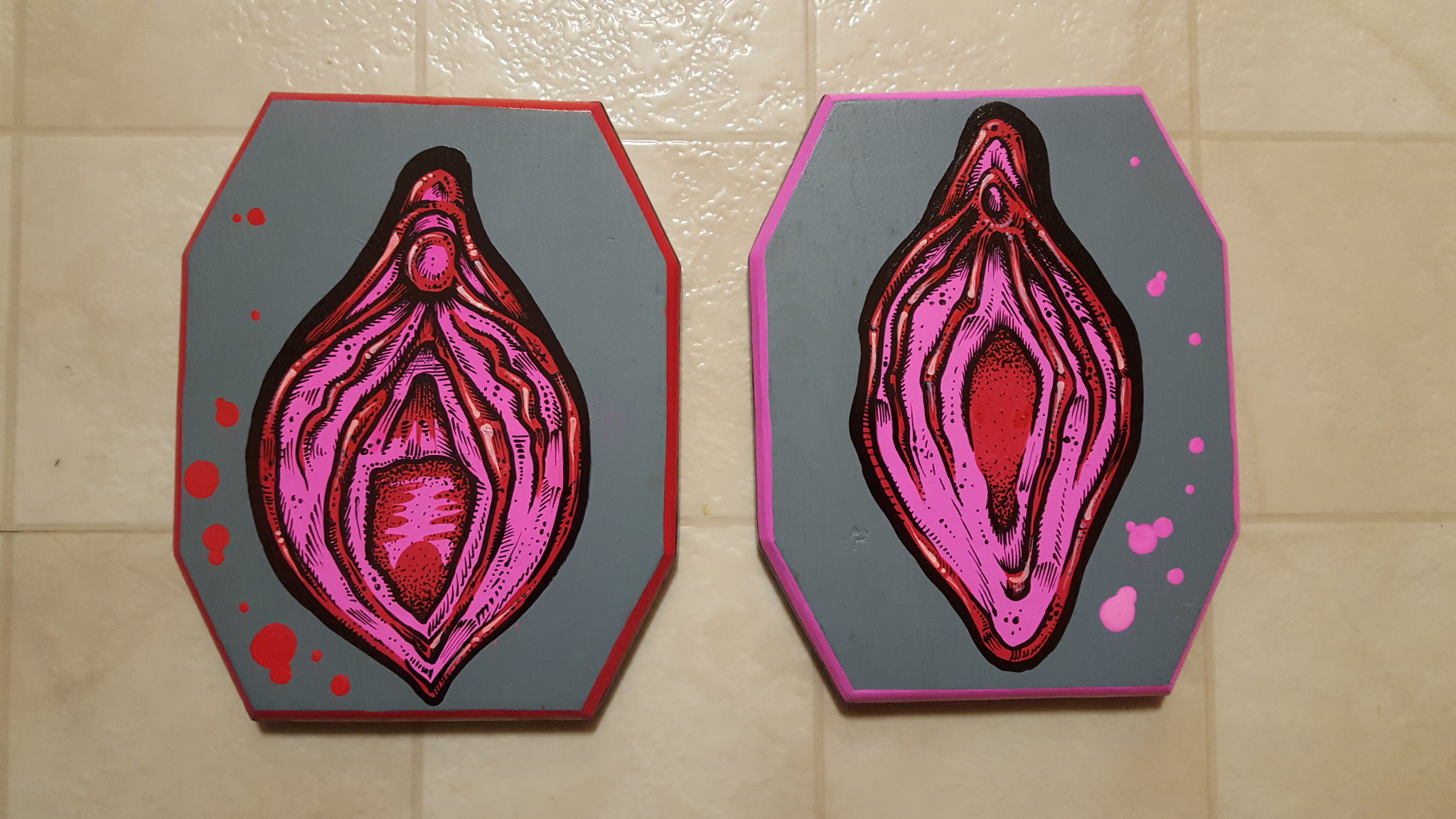 Two 5x7 pieces in acrylic and oil on wood, each depicting a vagina. Together, as they are intended to be displayed and experienced, they are "Two Vaginas".