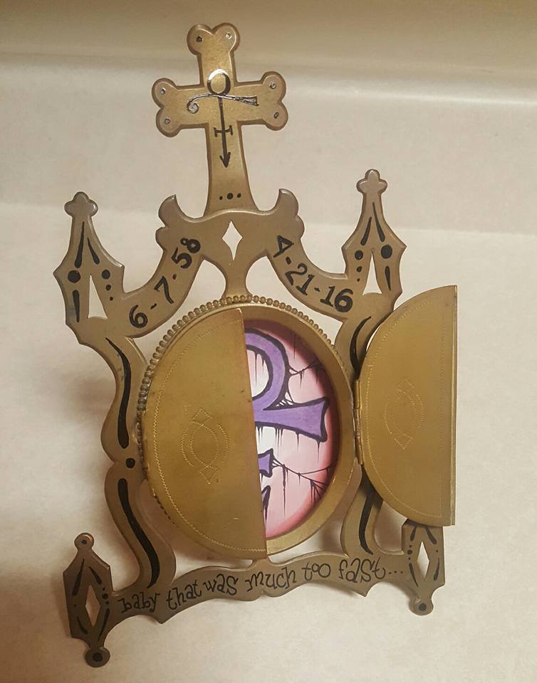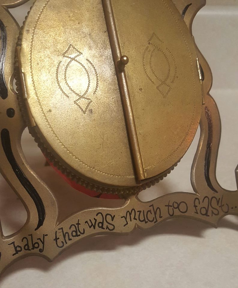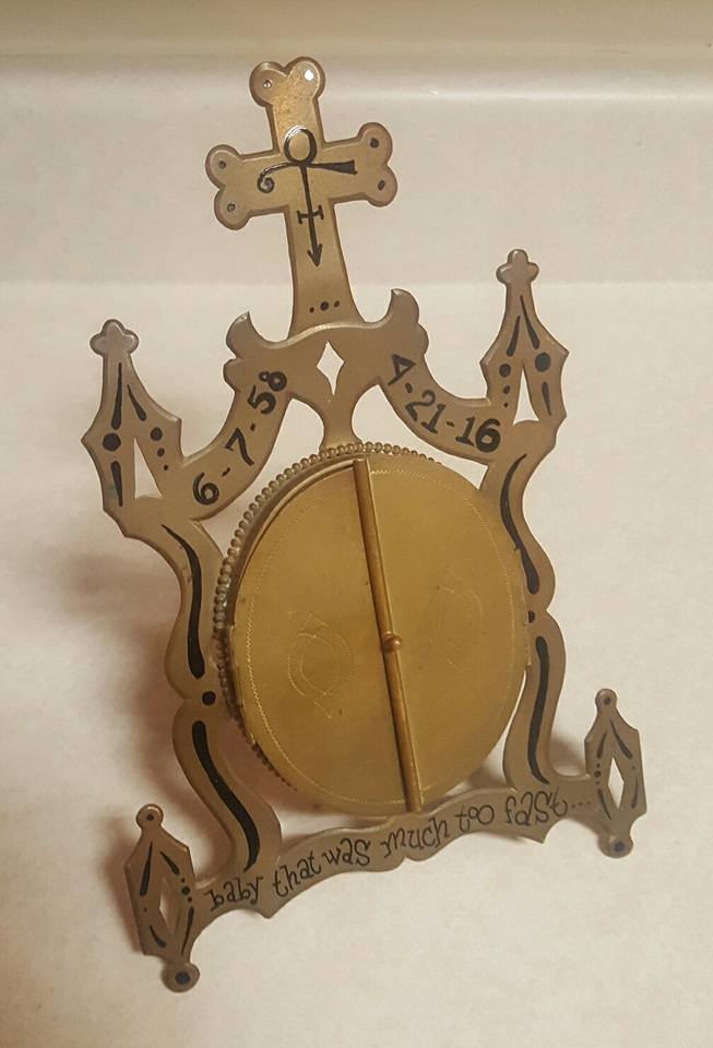 Aprox 10" tall and 6" wide. Doors open. Can by hung or also has an intact foldout stand.