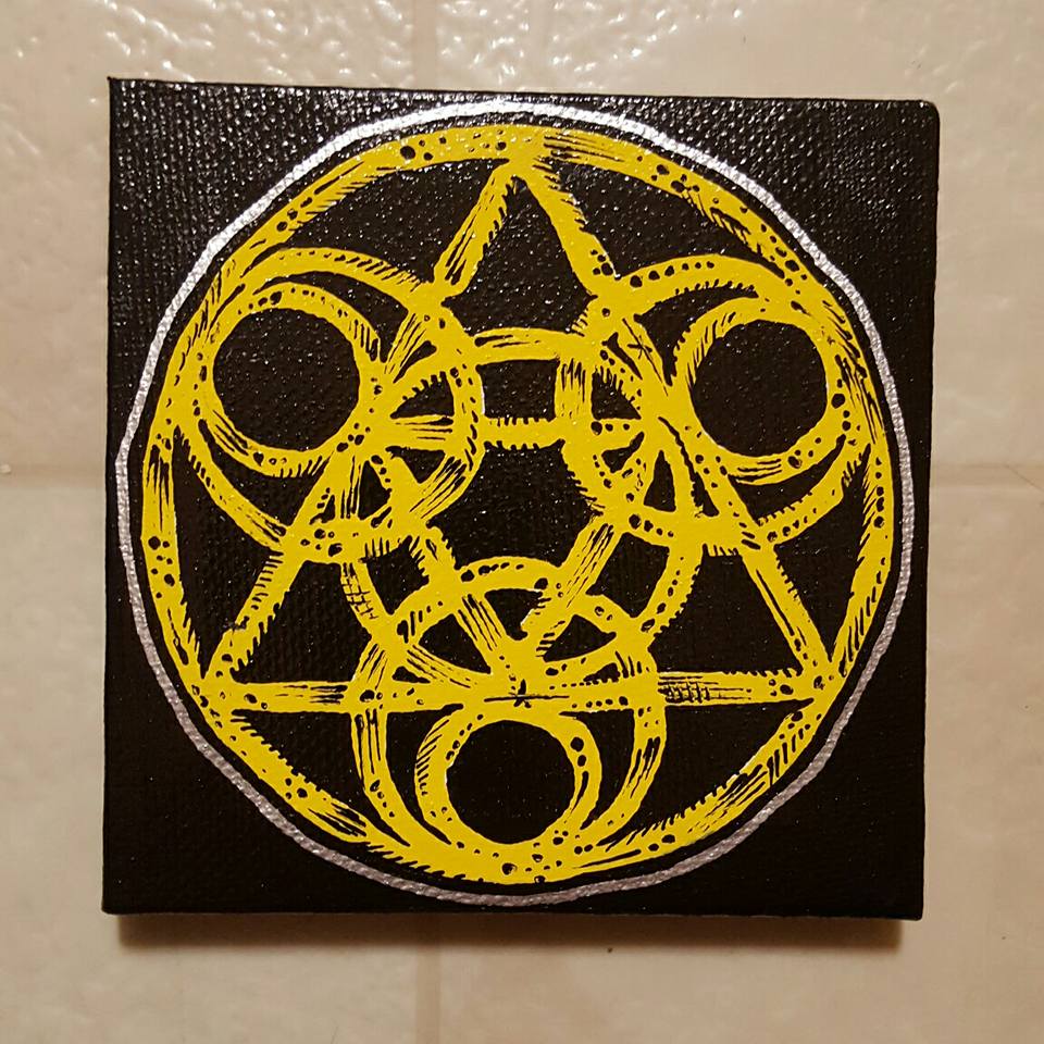 4" mini stretched canvas with this hybrid of sacred geometry and pentacle style symbols painted in acrylic and oil.
