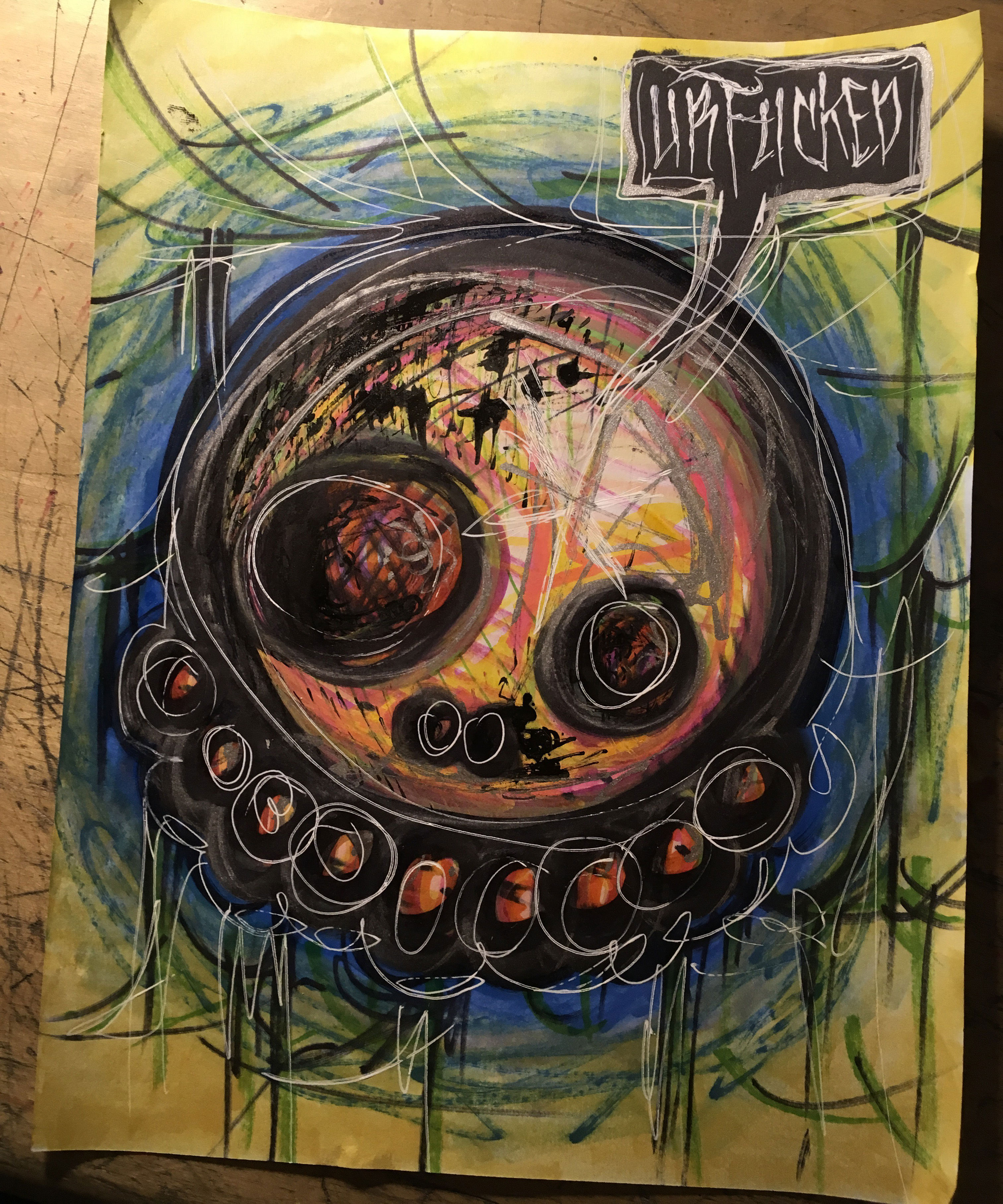 Acryllic, oil, marker, gel pen on 70lb paper.
